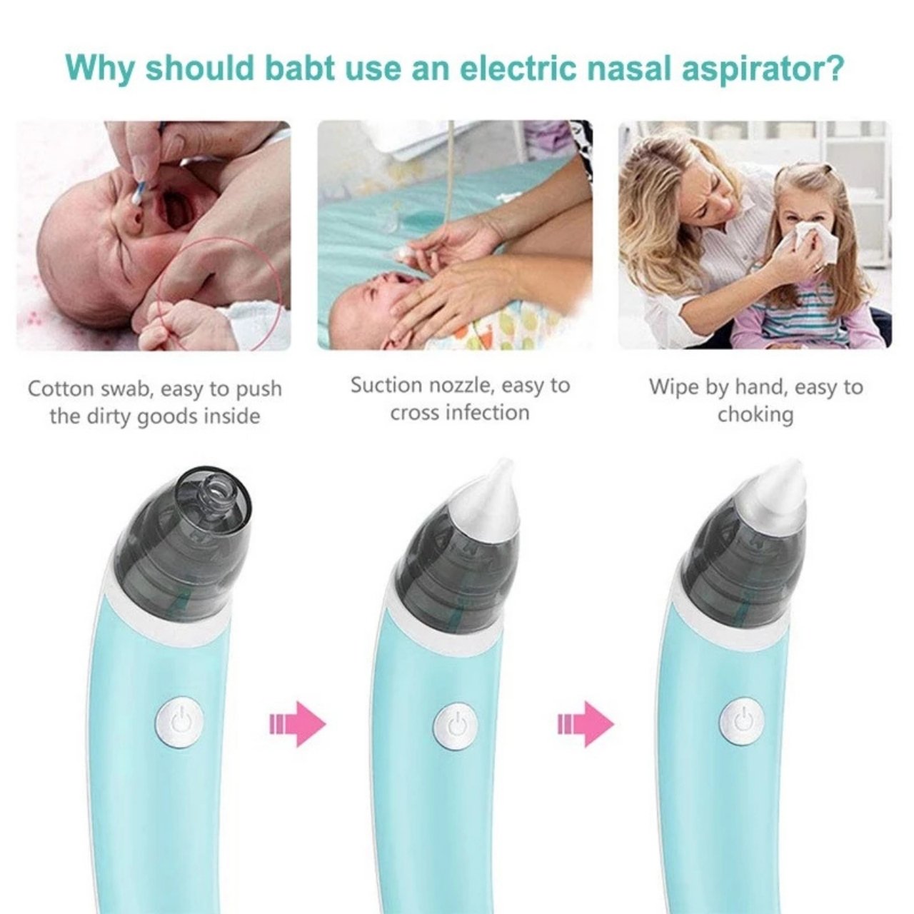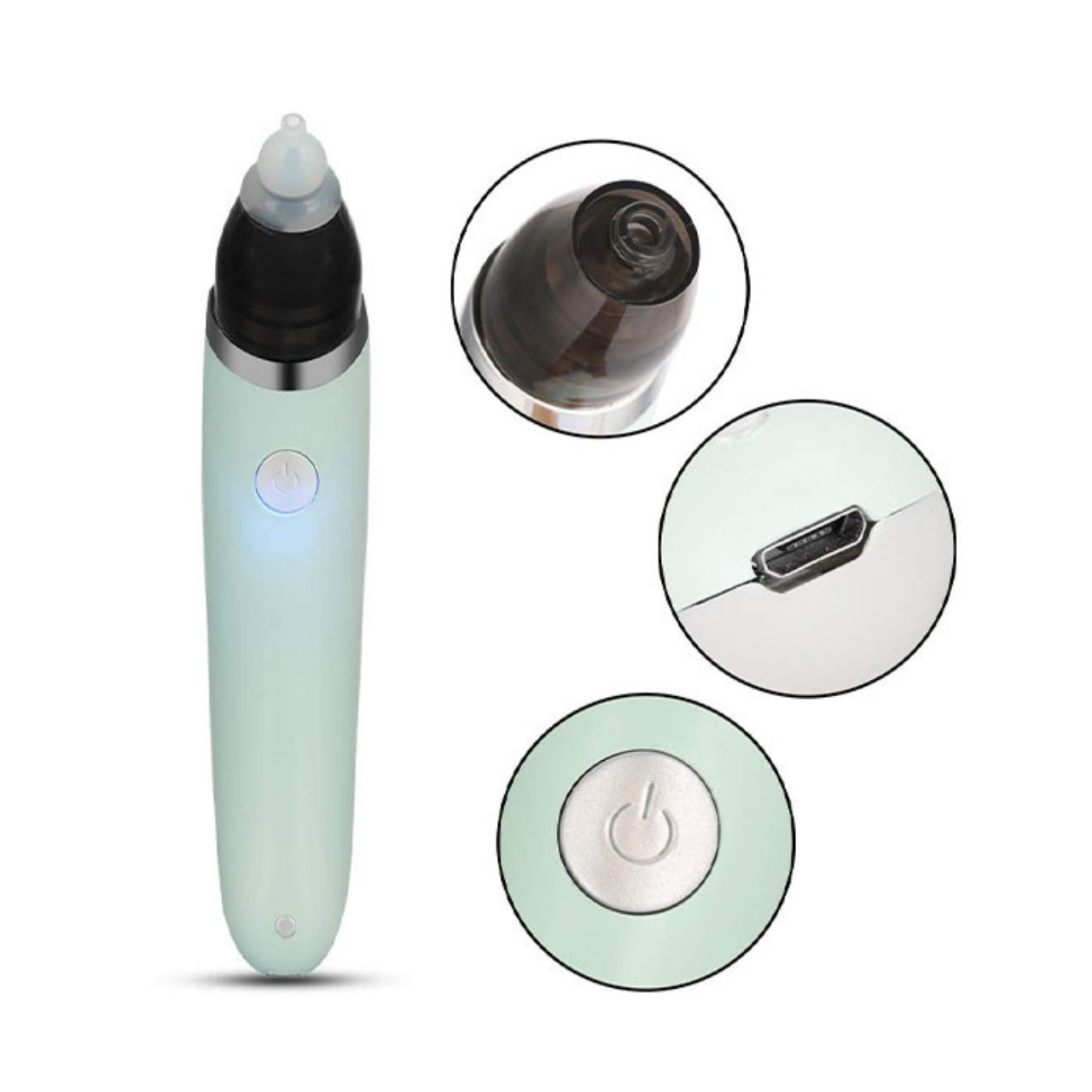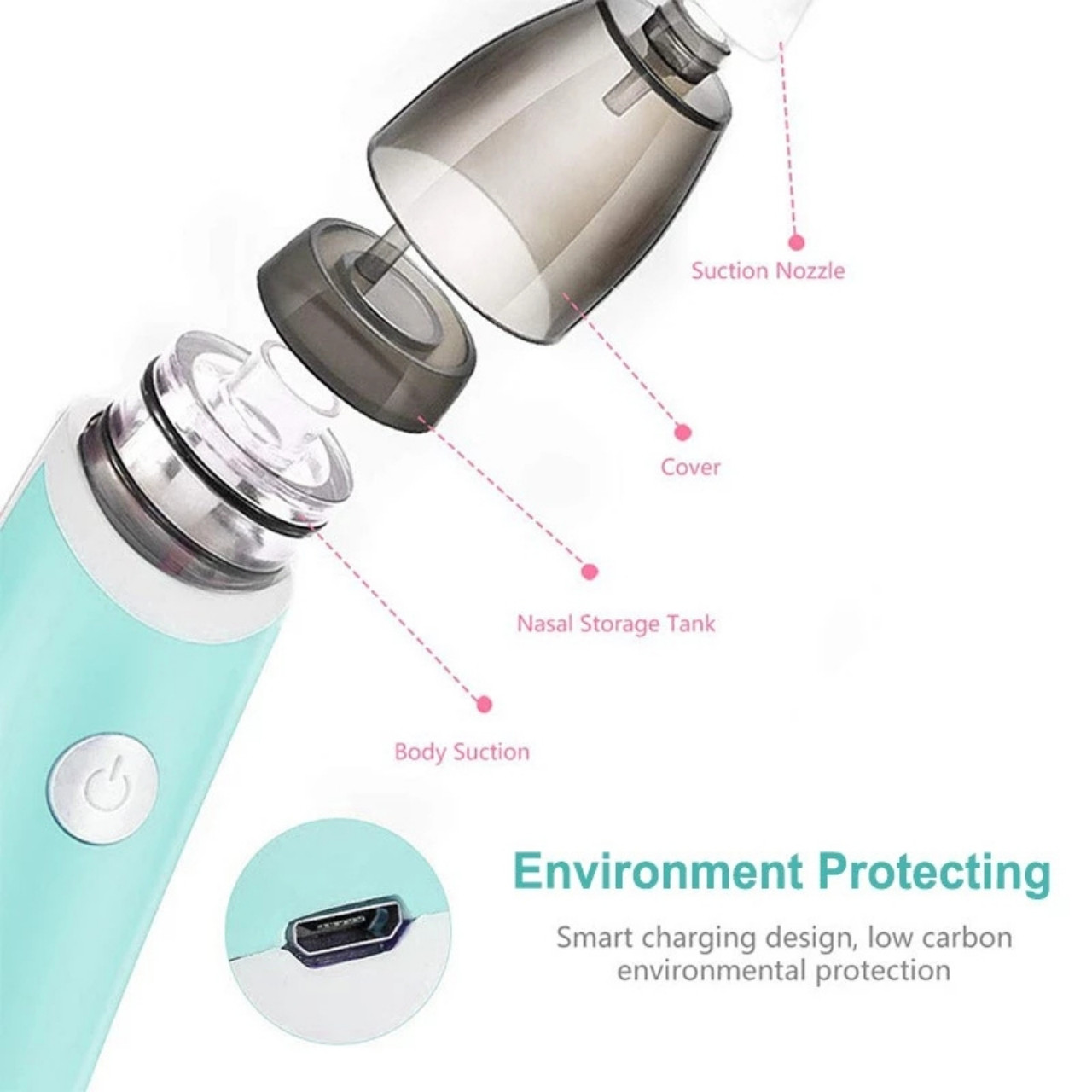| V balení: | 1x nosní odsávačka, 2x silikonové nástavce v různých velikostech, 8x houbičky pro snadné čištění, 1x USB nabíjecí kabel |