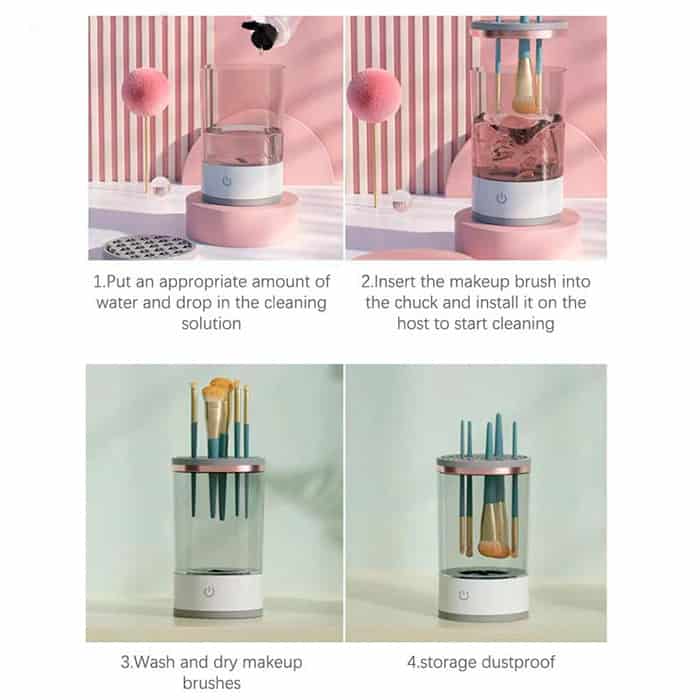 Pro čištění nalijte do nádoby odpovídající množství vody (až po maximální značku). Pokud chcete, přidejte do vody pár kapek mýdla nebo čističe na štětce. Vložte štětec na make-up do držáku a umístěte ho na nádobu. Stiskněte tlačítko zapnutí. Po vyčištění vypněte přístroj, vylejte vodu a štětce obráceně položte na sušení. Zařízení nabíjejte pomocí dodaného USB kabelu.