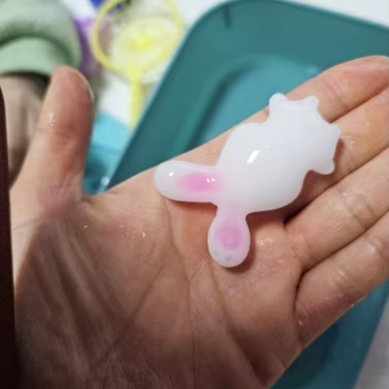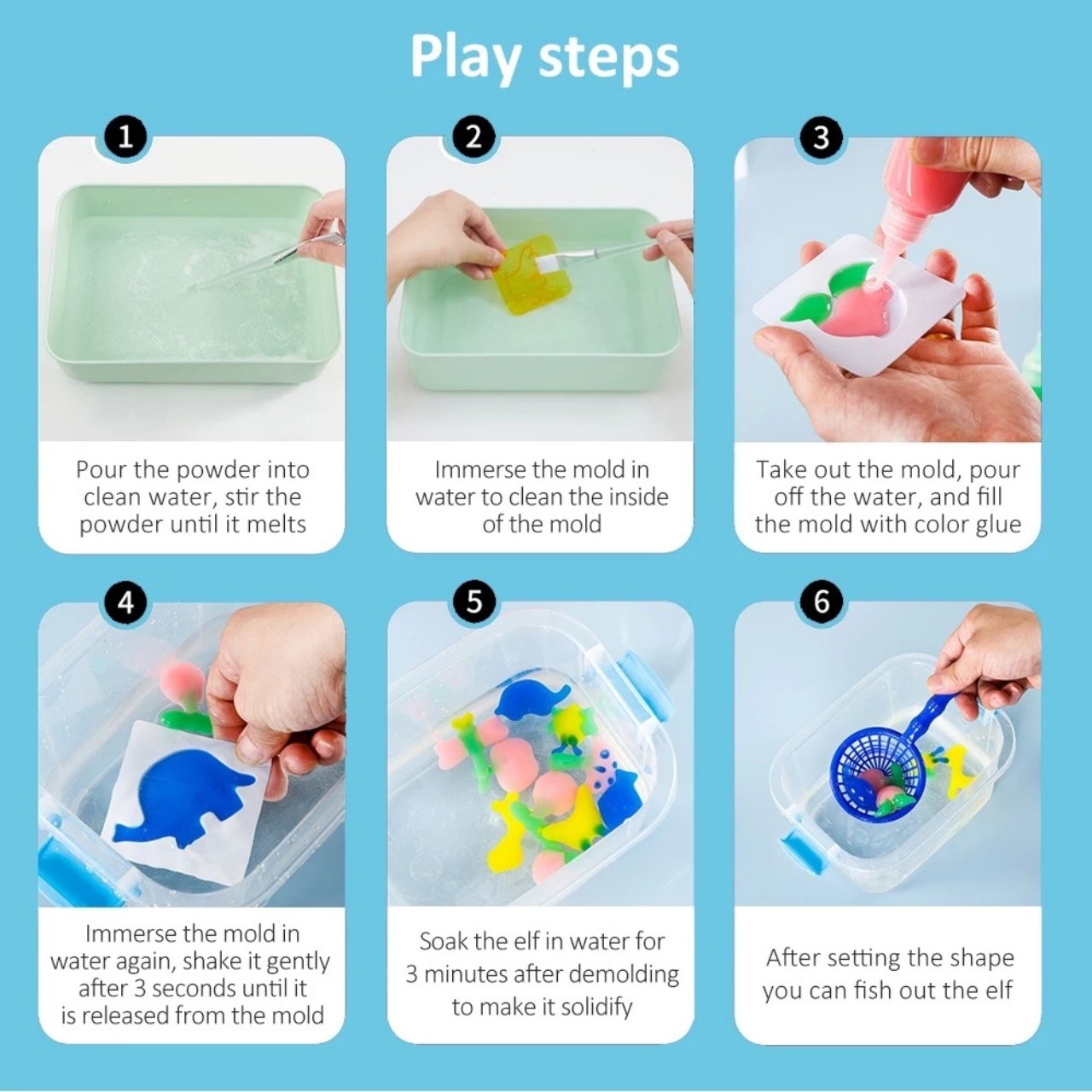Připravte roztok. Smíchejte sáček laktátu vápenatého s 1 litrem vody, dokud se zcela nerozpustí. Ponořte model do roztoku a ujistěte se, že je důkladně nasáklý. Naplňte formu barvami dle vašeho výběru. Ponořte model s barvami do vody, aby se design zpevnil. Nechte formy ve vodě alespoň 15 minut. Nejlepších výsledků dosáhnete, pokud je necháte 3-4 hodiny.